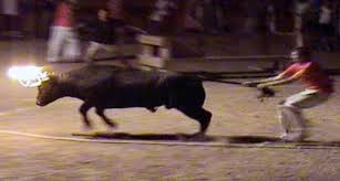 El toro de fuego o toro embolado : Se inmoviliza al toro atándolo por los cuernos y sujetándolo por las patas y el rabo. Se le ponen unas antorchas o bolas de material inflamable en los cuernos untados con alquitrán y se les prende fuego. Luego se suelta al animal en una plaza o por las calles. Aterrorizado al ver su cabeza envuelta en fuego, el toro muge desesperadamente, babea y da cabezazos intentando deshacerse de las antorchas y bolas, de las que cae líquido candente y brasas que queman los ojos, el morro y el cuerpo del animal. Esta tradición se celebra en varias localidades de Tarragona, como Amposta. En ocasiones se colocan fuegos artificiales en los cuernos.
