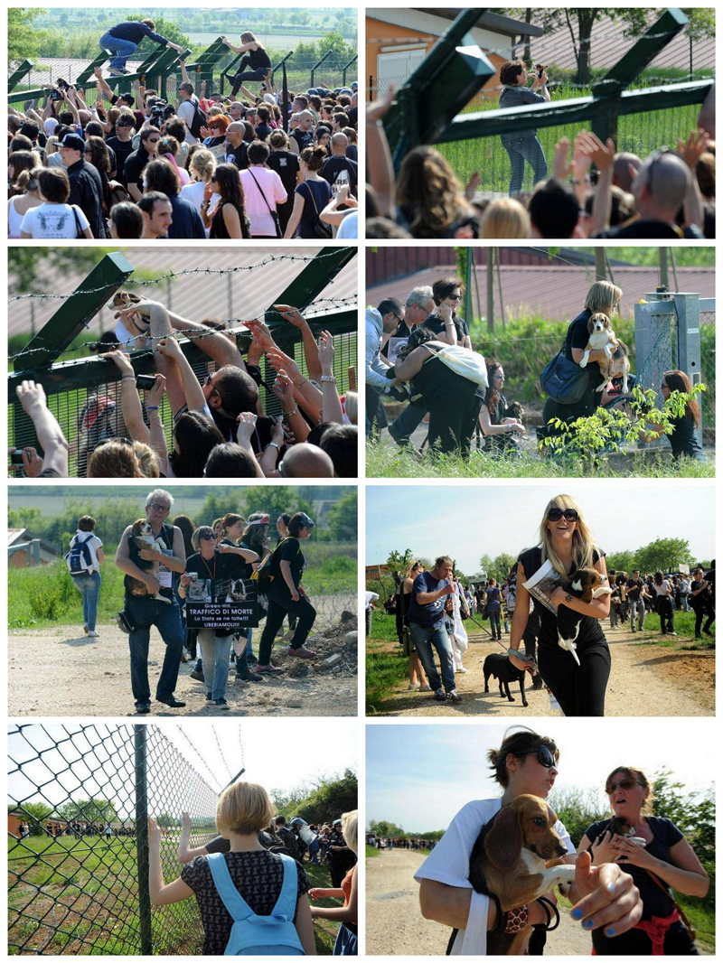 A eso de 16:15 un grupo de los manifestantes que participaban en la manifestación contra las actividades de cría para vivisección de la empresa Green Hill, cuyas instalaciones albergan a 2500 beagles, se subieron encima de la valla para llegar a las jaulas donde los animales estaban encerrados. Ni la policía ni los Carabinieri pudieron evitar que los manifestantes consiguiesen entrar. Cuando el primer animal rescatado apareció, la alegría de los manifestantes fue claramente evidente con gritos y aplausos. Docenas de animales fueron apareciendo en brazos de sus rescatadores, ayudando incluso a sacarles por encima de la valla.